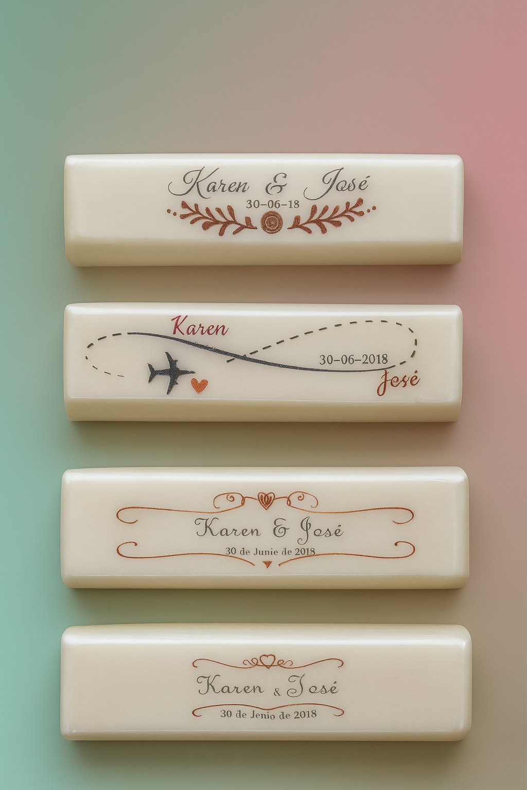 Chocolates personalizados con nombres, fechas y diseños especiales. Perfectos para bodas, aniversarios o cualquier ocasión significativa.